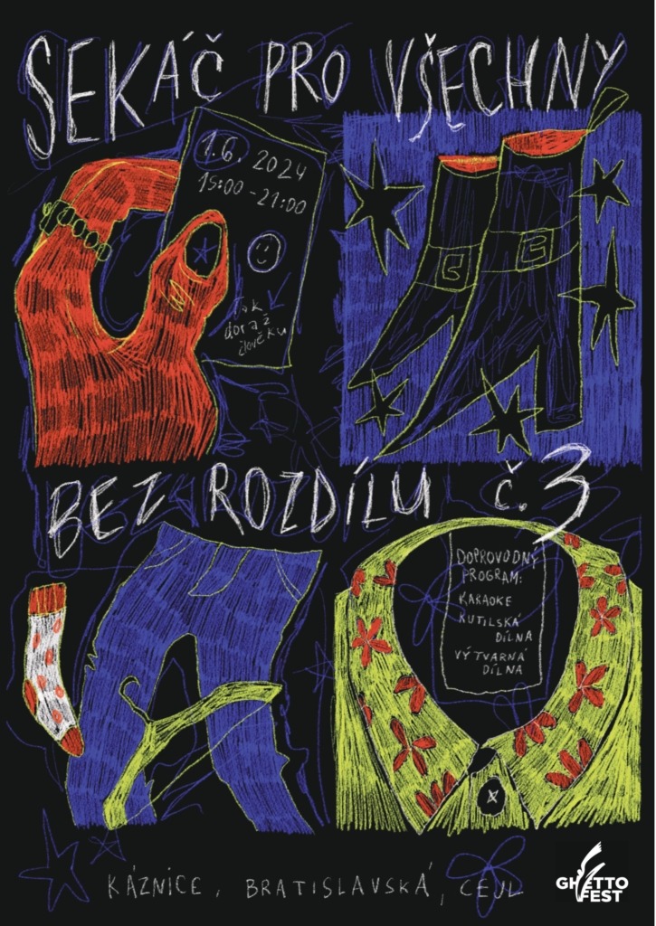 Každý ve svém šatníku schraňuje haldy oblečení, které nemá žádné využití. Proto jsme se po vzoru našich pražských kamarádů z Jako doma rozhodli udělat brněnskou alternaci Sekáče pro všechny bez rozdílu. S prvním a druhým číslem sekáče si spousta lidí kolem nás sáhla do svědomí, ale co je ještě těžší sáhla si do šatníku a darovala mnoho módních kousků. Tak se sesbíralo velké množství oblečení, ze kterého se chystáme udělat již třetí ročník Sekáče 1. 6. 2024 v rámci akce Ghettofest.
